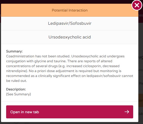 Резюме: Coadministration не изучен . Урсодезоксихолевой кислоты подвергается конъюгации с глицином и таурином . Есть сообщения о измененных концентраций нескольких препаратов ( например, повышенной циклоспорина , снижение нитрендипин ) . Нет априорно регулировки дозы не требуется , но мониторинг рекомендуется в качестве клинически значимого эффекта на ledipasvir / софосбувир не может быть исключена. Описание : ( См Резюме)