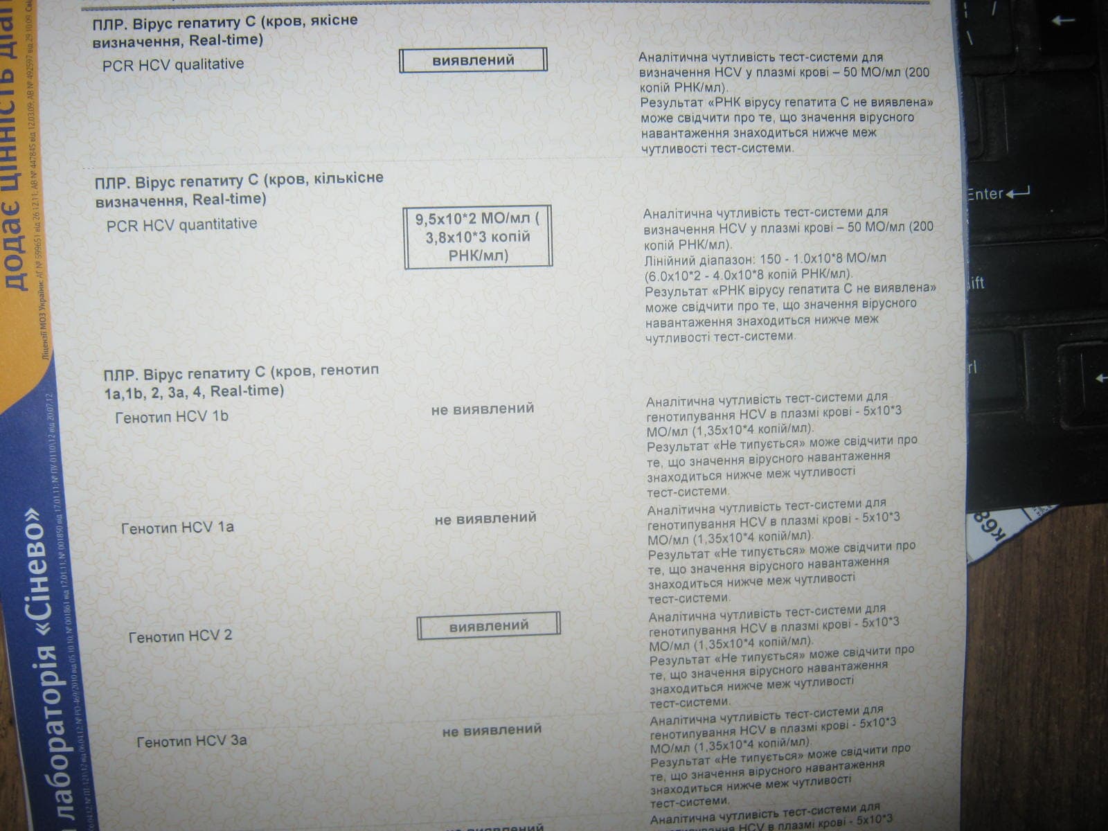 теперь понятно с нагрузкой. низкая она.реальность писал(а):PCR HCV quantitative 9,5х10*2 МО/мл (3,8х10*3 копій
