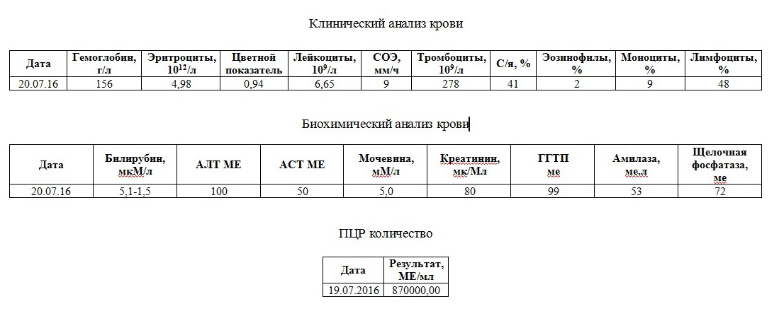 Вот мои относительно свежие анализы. Может перед началом терапии что-нибудь еще сдать? На что стоит обратить внимание? Если можно начать терапию, какие анализы сдавать и в какой срок по мере лечения?