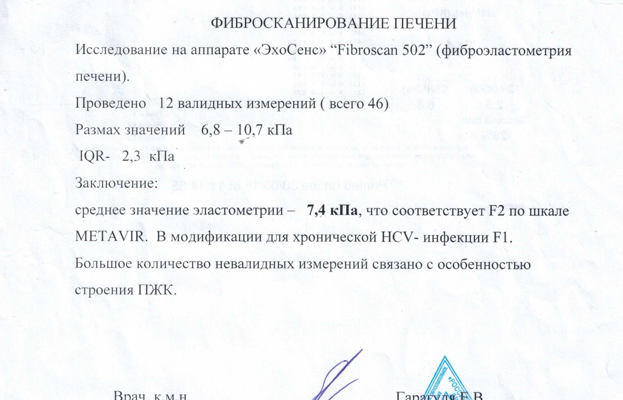 ) Результат Ф1, Ф2, а печень-то болит. Показывала результаты Бурневичу, его всё устроило. Но тут проблема в том, что к нему на прием попасть- как в Кремль к президенту: запись на месяцы вперёд, а сейчас он вообще в отпуске. Хочется начать ПВТ как можно скорее. Попробую прикрепить фиброскан.