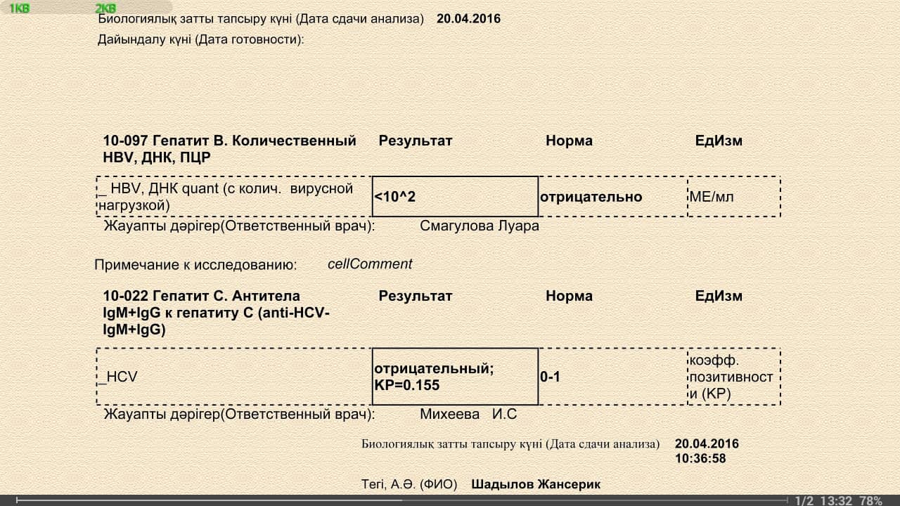 19.11.2016 Старт ПВТ Тенофовир; 5.01.2017 АЛТ 260; 15.02.2017 ПЦР 16000МЕ/мл, 15.05.2017 - 560МЕ/мл, АЛТ 31; 18.10.17 - не обнаружен, 5.01.18 - АЛТ 16; 1.06.2018 qHBsAg 1238ME, 12.04.2021 qHBsAg 750ME