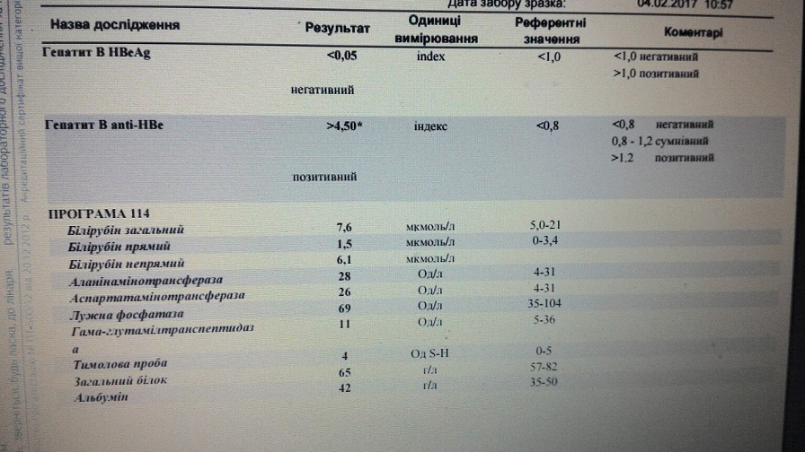 HbsAg +, HbeAg -, AntiHbe +, ПЦР (кач/колич) -/-, биохимия норма