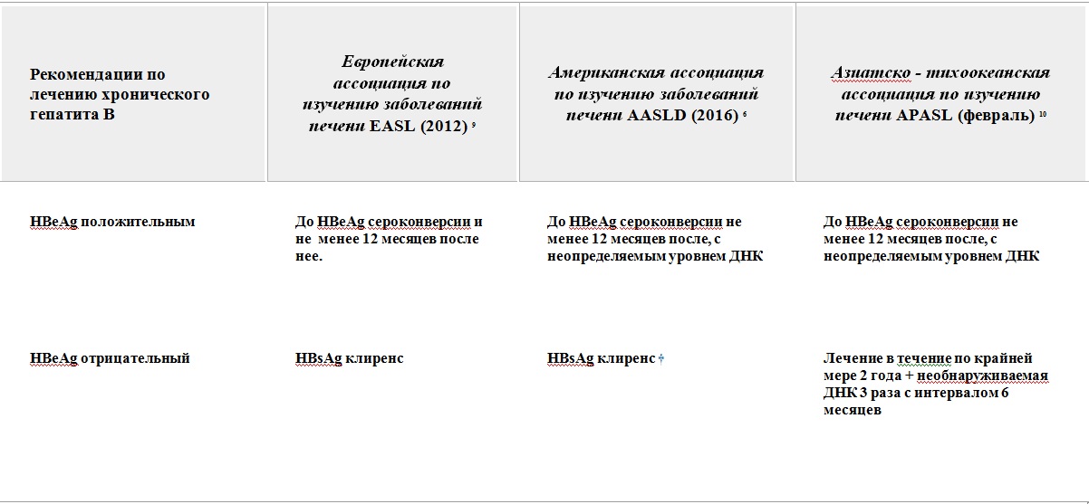Решения по началу терапии основаны на фазе инфекции, оценке стадии фиброза и риске развития ГЦК. Основной целью лечения является улучшение выживаемости пациентов путем предотвращения или задержки развития цирроза и ГЦК. Вторичные цели включают (I) подавление HBV - ДНК, (II) биохимическое и гистологическое улучшение и (III) , иммунологический контроль вируса, в частности , потери HbsAg и развитие HBsAb, хотя эти цели и редко достигаются. [ 6, 8 ] Таким образом, рекомендуется, что лечение не должно прекращается до тех пор, пока не наступит серконверсия по HBeAg и не менее 6-12 месяцев терапии после нее. Либо достижение HBsAg клиренса [ 8-10 ] (таблица 3 ).