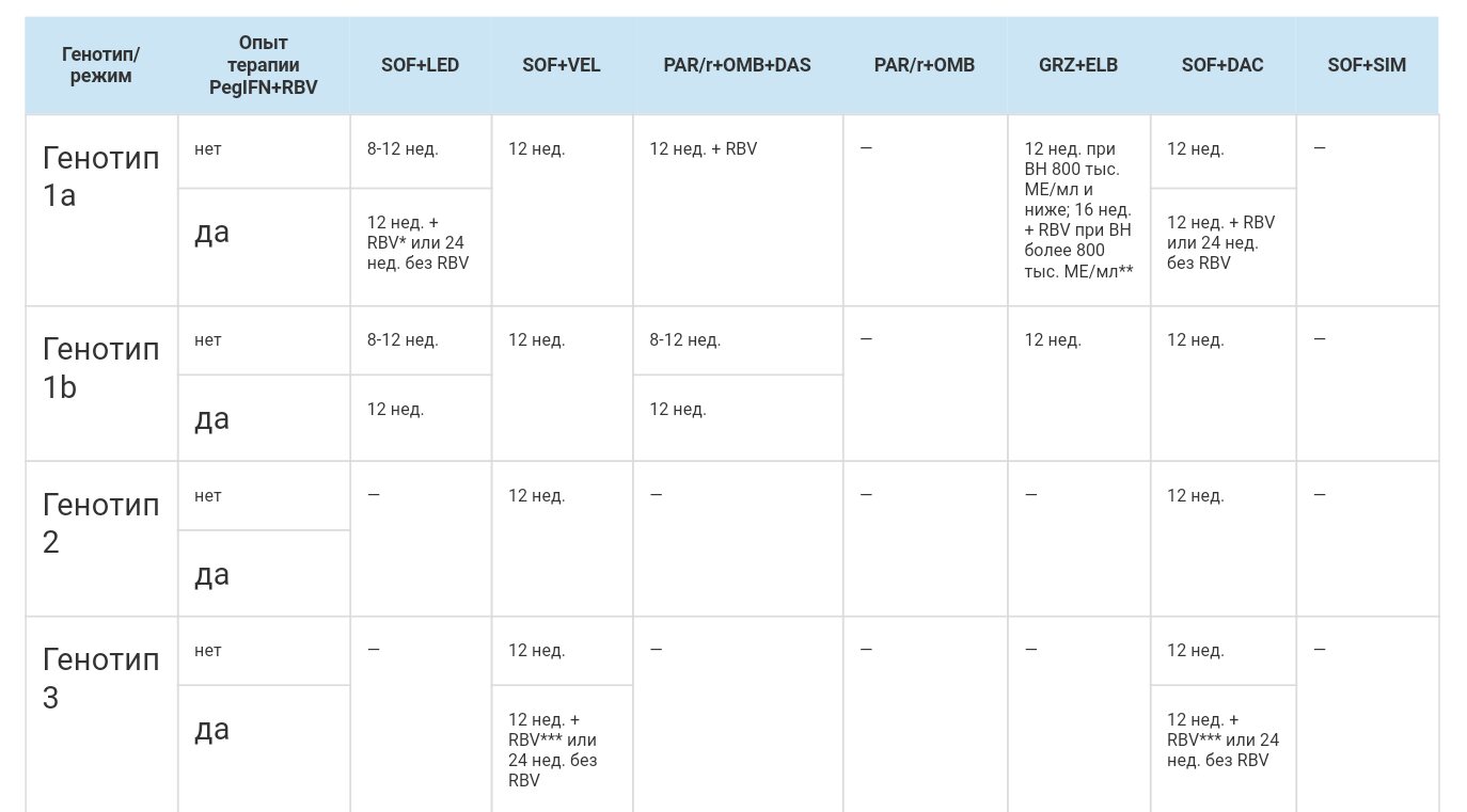 А еще с табличкой запуталась. Если денежки есть, то соф+вел, да? Вот в таблице в начале строки соф+вел 12 нед, а в конце соф+дак 12 нед. Это "или" или сначала одно 12 нед, а потом другое. Сколько вообще должно лечение идти? Читала про схемы 12, 24. Какая наша?