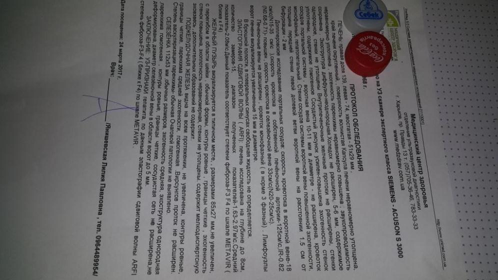Фиброскан 08.2015 (11.0 КПа ) 01.2016 (10.4 КПа, 07.2016 -7,9кПа