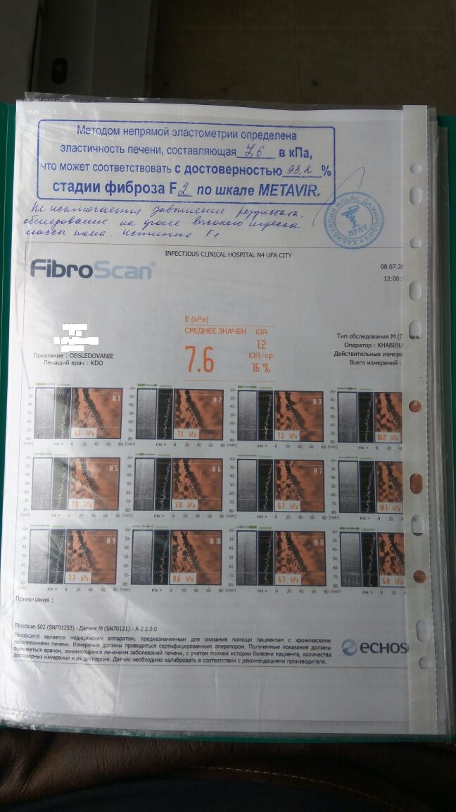 Сначала хочу рассказать нашу историю. В 2013 году муж пошел сдавать кровь, у него взяли анализы , выявили Гепатит C. Подозреваем, что заразили в стоматологии..Начали обследования, "прокАпался" в Инфекционной больнице, определили генотип 3а, прошел фиброскан (F0 была, вирусная нагрузка 1,5*10^6 Ме/мл), встал в очередь на лечение. Сделали прививки от гепатита В. Недавно узнали про новые лекарства, решили начать лечение. Сегодня прошел Фиброскан. Результат прикрепляю. Результат F2 (с пометкой врача"не исключено завышение результата обследования не фоне высокого индекса массы тела, истинно F1"). Сдали сегодня также ПЦР с чувствительностью анализа в 60ME/мл, ОАК, ОАМ, биохимию, завтра пойдет на УЗИ.
