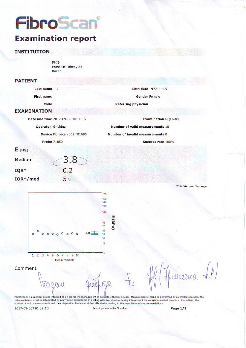 По совету подруги, которая тоже сейчас проходит терапию, дочь сделала фибросканирование. Степень фиброза F0