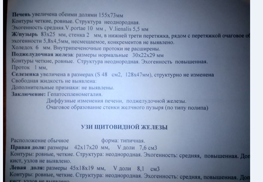 По УЗИ печень увеличена, причём обееми долями. Ну эт ладно, гепатитая она. После лечения прийдёт в норму. Но селезёнка тож увеличена ( норма до 40см2)!