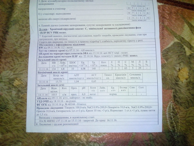 О гепатите узнала осенью в 2016 году, когда устраивалась на новую работу, а точнее хотела устроится и уже проходила различного рода собеседования и медосмотры. В большой куче бумажек на анализы и осмотры были и гепатиты С и В. Пришла в инфекционку, сделали тест на антитела, В - отрицательный, С - положительный. После сдавала в другой лаборатории и опять положительный. Шок, боль, разочарование в жизни, слёзы. Период осознания болезни проходил тяжело. Сдала ПЦР РНК HCV - тоже положительный. Один раз лежала в инфекционке, как мне говорили для очищения печени... Генотипирование и количественный анализ не сдавала, так как инфекционист сказала, что эти анализы имеет смысл делать если планируется ПВТ. У меня ПВТ планируется в мечтах, так как материальное положение не позволяет, средств на лечение нет и в ближайшее время не предвидится, получаю субсидию на оплату ком.услуг, да и маленький ребенок - всё на него идет. Знаю, что это был мой выбор родить ребенка, но по другому я бы не сделала. Раз забеременела - вперед только рожать. Есть результат УЗИ, правда еще годичной давности, попозже выложу. Есть там проблемки судя по всему.