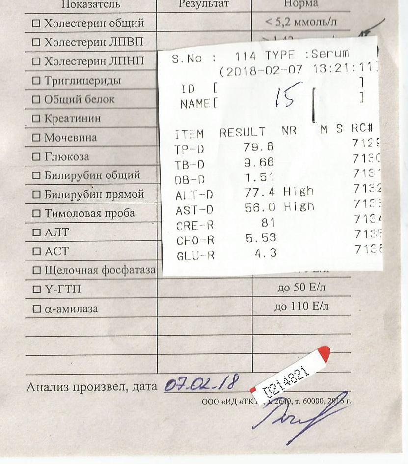 Общий анализ крови, с лейкоцитарной формулой, биохимию ( АлТ, АсТ, билирубин общий и прямой, креатинин, ГГТ, щелочная фосфатаза, альбумин, глюкоза, холестерин, альфа-амилаза) Желательно сдать АФП.Gamala писал(а): какие еще анализы мне нужно сдать сейчас?
