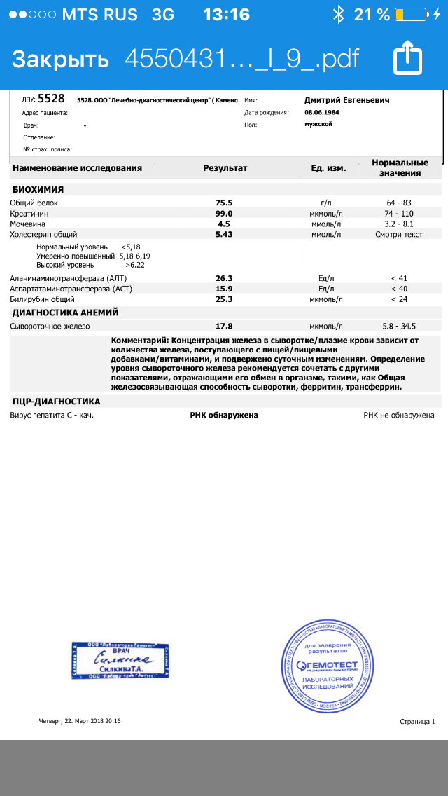 После двух недель терапии соф+дак (Индия),сдал пцр количество+ биохимию алт 39 аст 20, вир. нагрузка 410 копий ... ну думаю ,не хило так вирь наполучал !!! Ещё через неделю пошёл сдал пцр качество+ биохимию , ВИРЬ обнаружен, алт 26 аст 15. Все анализы сдавал в Гемотесте.