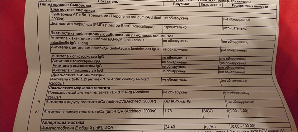 беспокоило дурнота по утрам (сердцебиение и иногда экстрасистолы), белый налет на языке, прописали урсосан + антибиотики на месяц, пропил, вроде стало чуть лучше. налет не ушел, сдал соскоб с языка, обнаружены грибы. ок, думал от иммунитета, на такой диете (рис на воде, хлеб не ел, никакой, пюре на воде, иногда тушеные овощи, индейка тушеная через блендер, водичка теплая с медом, ну иногда курочка вареная...) все, вся моя еда. а тут еще заметил сухость между пальцев рук, и чето меня осенило! этож тоже грибок, ёмае! подхватил хорошее ОРВИ (вылечился пару недель назад), заодно зашел к инфекционисту, сказала пить флуконазол, 10 дней по 150мг. побочки почитал, чуть волосы не выпали. ну рискнул, пропил.. становится чуть лучше потихоньку. так вот, наконец к теме форума... с грибком между пальцев меня отправили к дерматологу, ждать два дня очереди в бесплатную не захотел, пошел в платку. там ниче путевого не сказали... и да, вылези у меня еще на животе розовый лишай или разноцветный, вот про него спросил, выписала мазь (прошло почти уже), а пор поводу грибка, сказала надо сдать анализы, на все. ну типа тыщ в 10 уложишься, все проверишь. посоветовался с инфекционистом, она сказала это вообще зачем? деньги потратить. думал, думал, сдал анализы. а там положительные антитела к Гепатиту C... сказать что расстроился, ничего не сказать. пошел вчера в инвитро, повторил такой же, плюс GWH/ антитела также выявлены а вот ПЦР отрицательно... так я и оказался здесь. анализы выложу чуть ниже, все что есть. там и оак и биохимия какая-то в динамике. если не трудно подскажите что дальше и как. куда двигаться. к чему готовиться? все плохо? боюсь фиброза... до 6 августа, возможности сделать эластометрию нет. врач в отпуске(( пробовать ехать в другой регион? или пока не к спеху? насколько все могло усугубиться за эти месяцы?