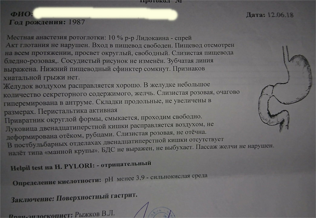 после ФГДС обещал к ним зайти и наконец таки, на след день добрался на ФГДС, а там эрозивный гастрит +дуоденит. конечно ни один врач не говорит что это может давать такие симптомы. но я как то успокоился что нашел болячку, начал лечить желудок, диета. был 73 кг, щас 58. ну точнее, 58 стало еще тогда, в мае. спустя две недели после лечения желудка, вес перестал падать, так и стоит. ах да, перед ФГДС была еще кардиолог, кардиограмма моя напугала бабушку которая ее делает. а врач как то небрежно бросила, мол у тебя это давно наверно, просто ты не замечал, экстрасистолы эти. хм, тут я вспомнил про кардиограмму от 2011 когда мне было плохо, там они были тоже. в общем экг обе один в один, только после 11 года как раз и было рэгби и качалка, и никаких провалов сердца я там не замечал. это трудно не заметить. кста, рассказал все это кардиологу, она единственный врач которая почти угадала, сказала что я описываю язву желудка. инфекционист только анализ кала, мазок с носа на грипп, ничего не нашла и послала, сказала не ее клиент. гастро в бесплатной сказала делать ФГДС.