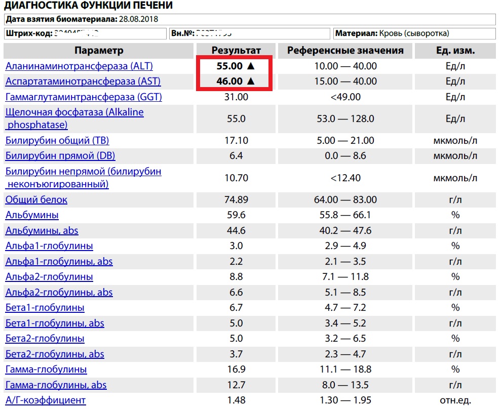 АЛТ- 368, АСТ - 264, ГГТ - 126
