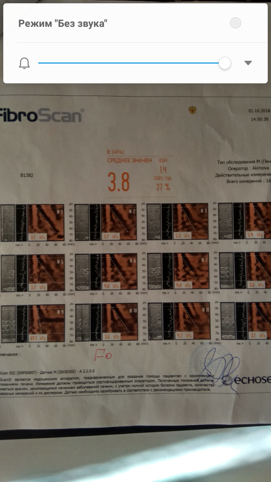 "Эластометрия F0. 3,8 кPА.среднее , в одном из 12 фото показание 69,1 kPA ?? FibroSkan 502 датчик М."