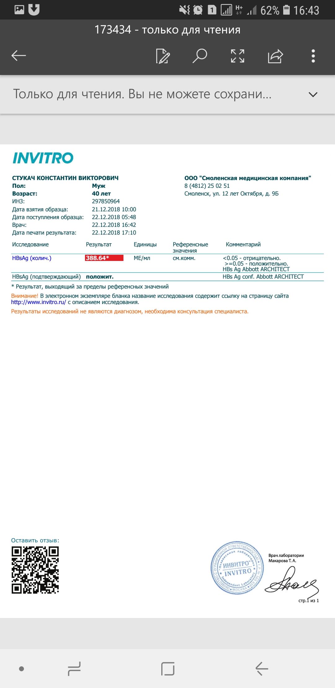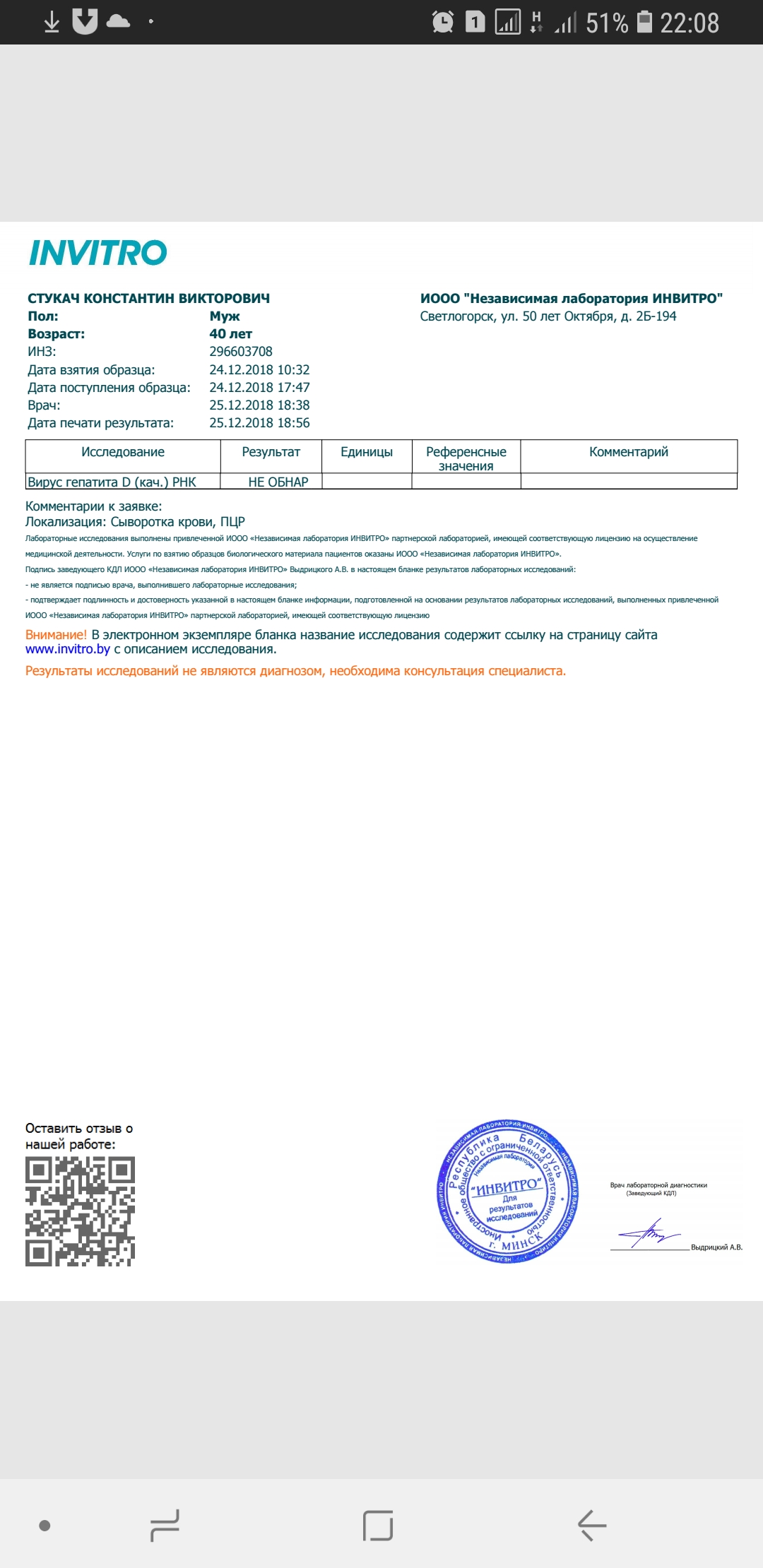 Дополню, что Костя не просто так решил начать терапию, а обследовался в Минской инфекционной больнице, и на тот момент у него было РНК HDV положительным. Поэтому он и получил разрешение на начало интерфероновой теры, съездил в Смоленск, купил альгерон, и как положено по рекомендациям сдал количественный HBsAg и количественный РНК HDV. После получения отрицательного количественного РНК HDV в Гемотесте, он еще раз пересдал уже качественный РНК HDV в белорусском Инвитро, и тоже получил отрицательный результат, что конечно радует, а терапия на данный момент отменяется.