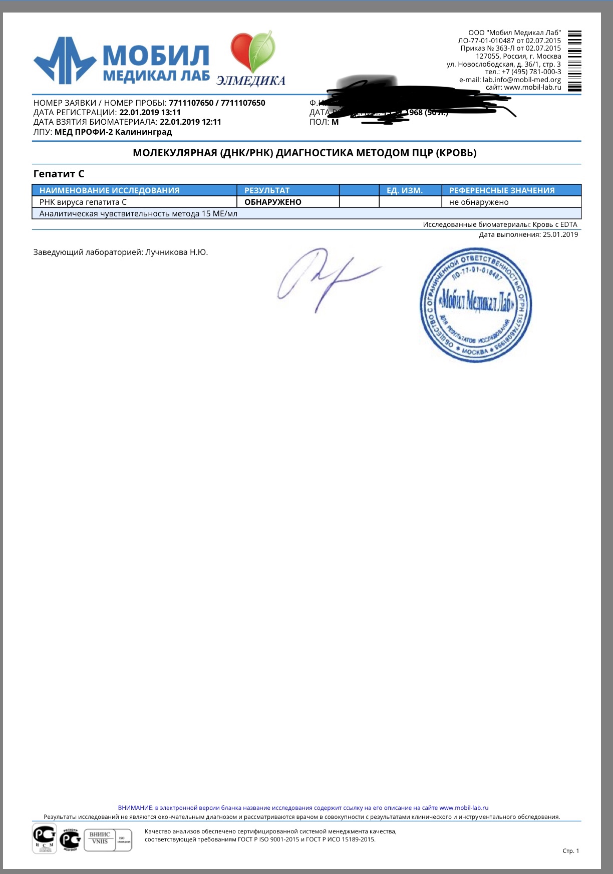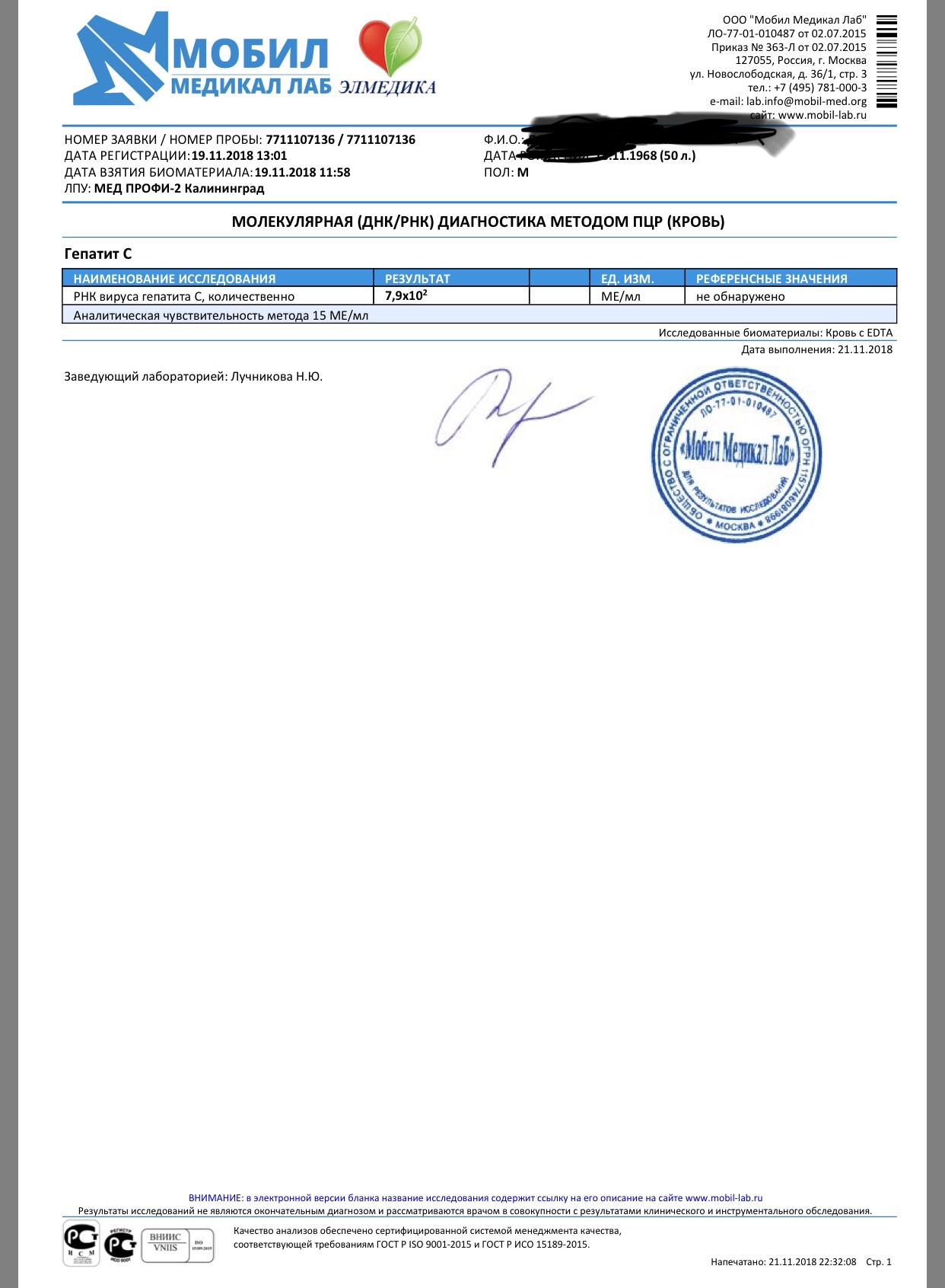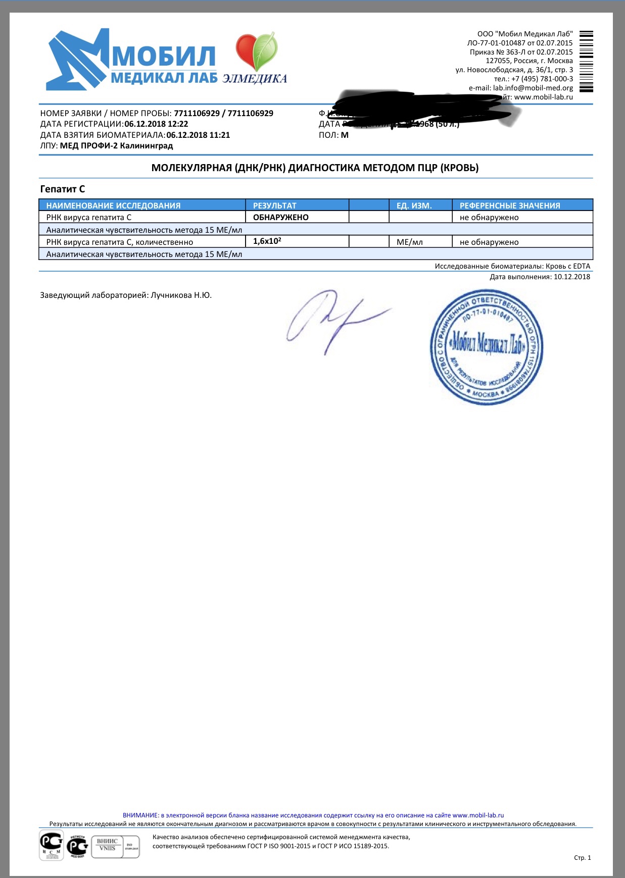 Добрый вечер !! На фотках вроде плохо видно . Гепатит С диагностирован в 2008 г. Генотип 1b . Терапия Альтевир+Ребетол 48 недель (-) на 8-ой неделе и до конца терапии. Рецидив через 2 мес. Повторная терапия : начало 05.11.2018 г . Фиброз F1-F2 , вирусная нагрузка на старте 1,3 на 10 в 6 . Софосбувир + велпатасвир (велпанат Natco) . Затем нагрузка падает до 7,9 на 10 в 2 ; затем до 1,2 на 10 в 2 ; затем НЕ ОБНАРУЖЕНО (-) . Терапия ещё продолжается , а получил результат сегодня (+) . Осталось выпить ещё 2 таблетки. Как так , что-то не пойму !! Получается рецидив во время терапии при том, что количество вируса стабильно снижалось. Может кто сталкивался с такой ситуацией ?? Всем Спасибо