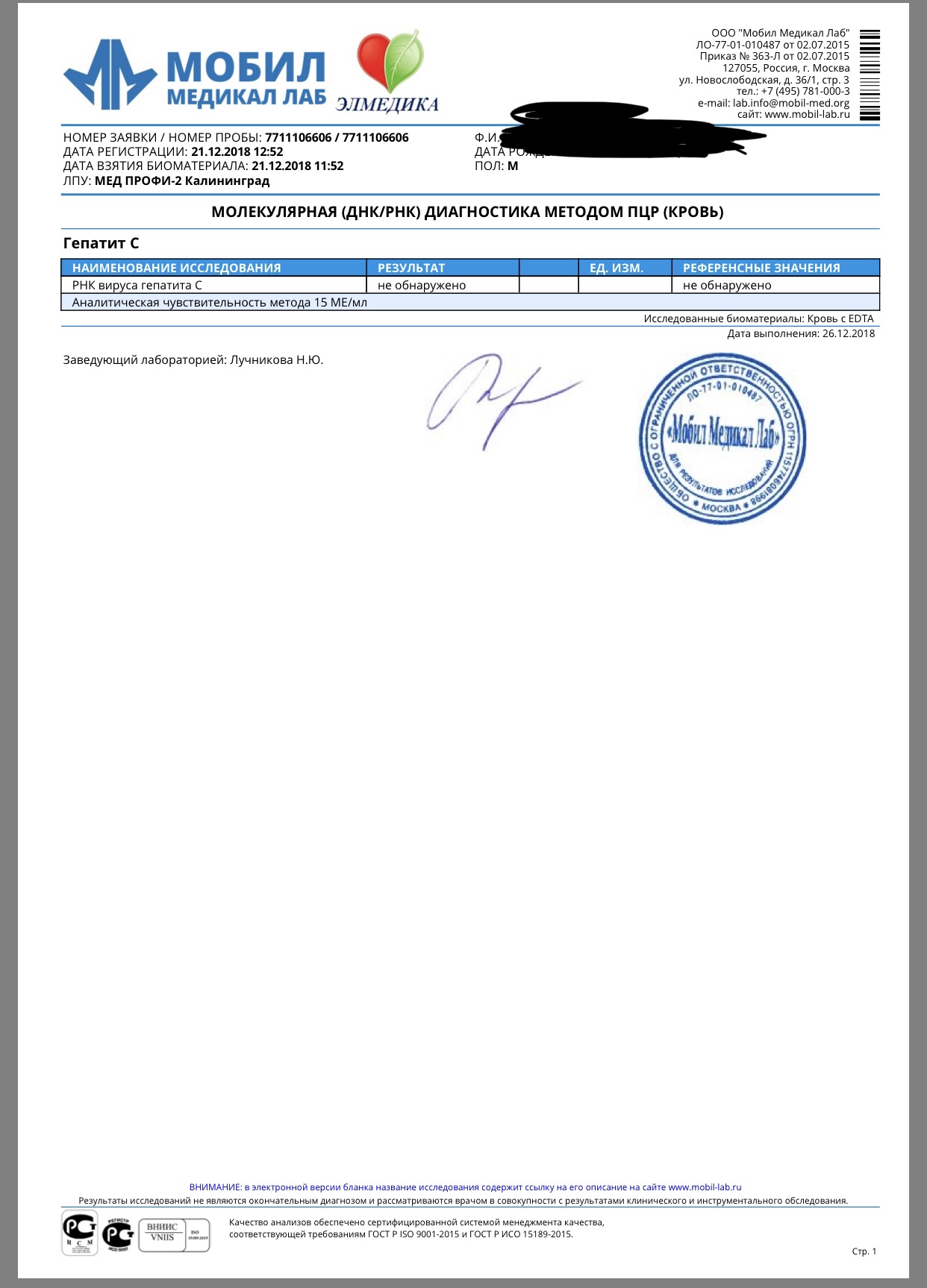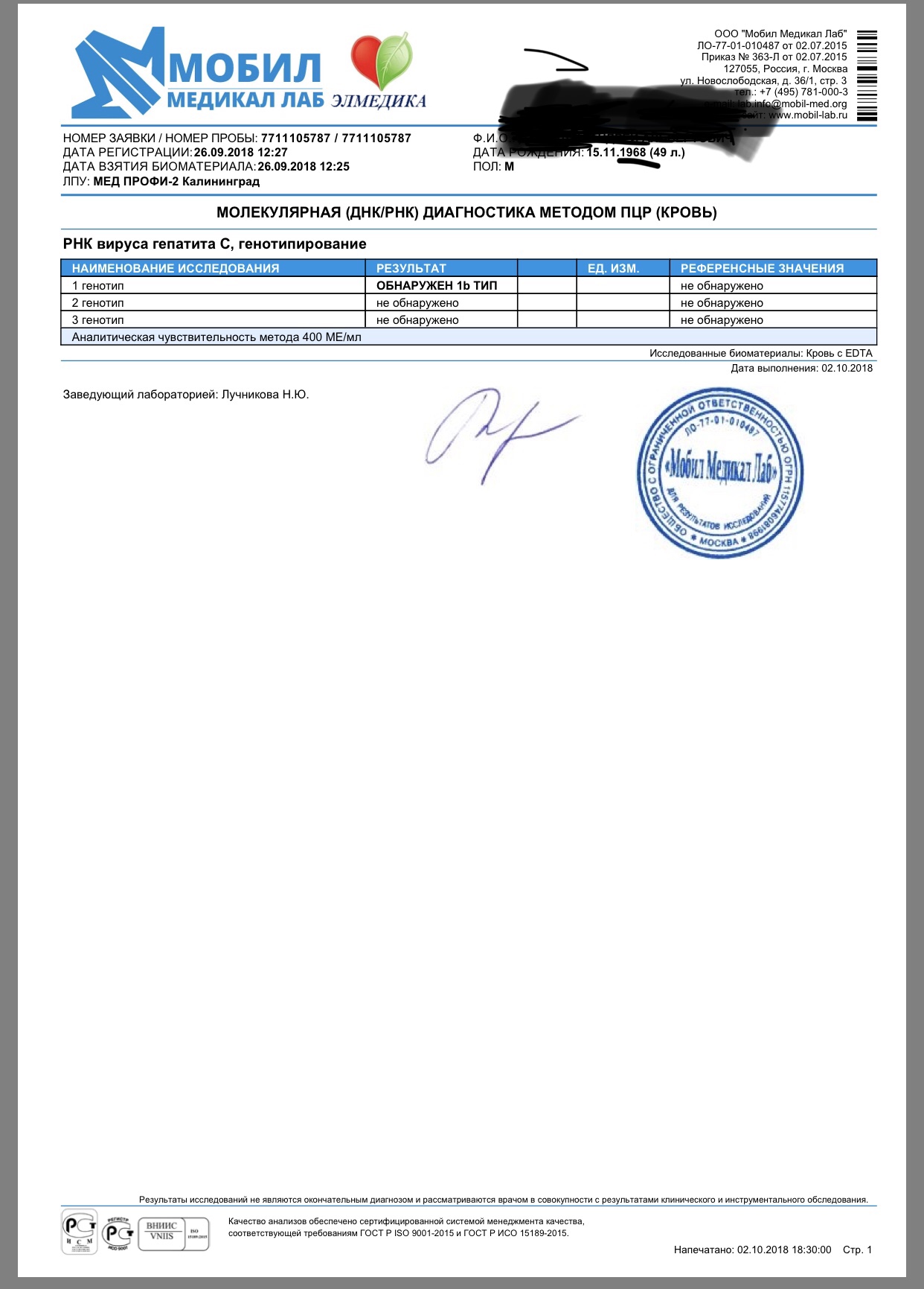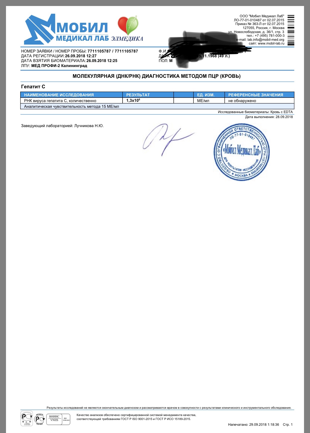 Добрый вечер !! На фотках вроде плохо видно . Гепатит С диагностирован в 2008 г. Генотип 1b . Терапия Альтевир+Ребетол 48 недель (-) на 8-ой неделе и до конца терапии. Рецидив через 2 мес. Повторная терапия : начало 05.11.2018 г . Фиброз F1-F2 , вирусная нагрузка на старте 1,3 на 10 в 6 . Софосбувир + велпатасвир (велпанат Natco) . Затем нагрузка падает до 7,9 на 10 в 2 ; затем до 1,2 на 10 в 2 ; затем НЕ ОБНАРУЖЕНО (-) . Терапия ещё продолжается , а получил результат сегодня (+) . Осталось выпить ещё 2 таблетки. Как так , что-то не пойму !! Получается рецидив во время терапии при том, что количество вируса стабильно снижалось. Может кто сталкивался с такой ситуацией ?? Всем Спасибо