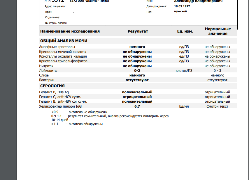 Самое интересное и по делу, это уже 2016 год. Мы семьей переехали в Ялту, ко мне приезжал товарищ погостить и что-то мы с ним не слабо так в течение недели выпивали. Он уехал. У меня прихватило. И я пошел сдать кровь. Вот тогда результат: Гепатит В - положительно. Там и другие анализы были, гепатит С, ВИЧ, паразиты - здесь все норм.