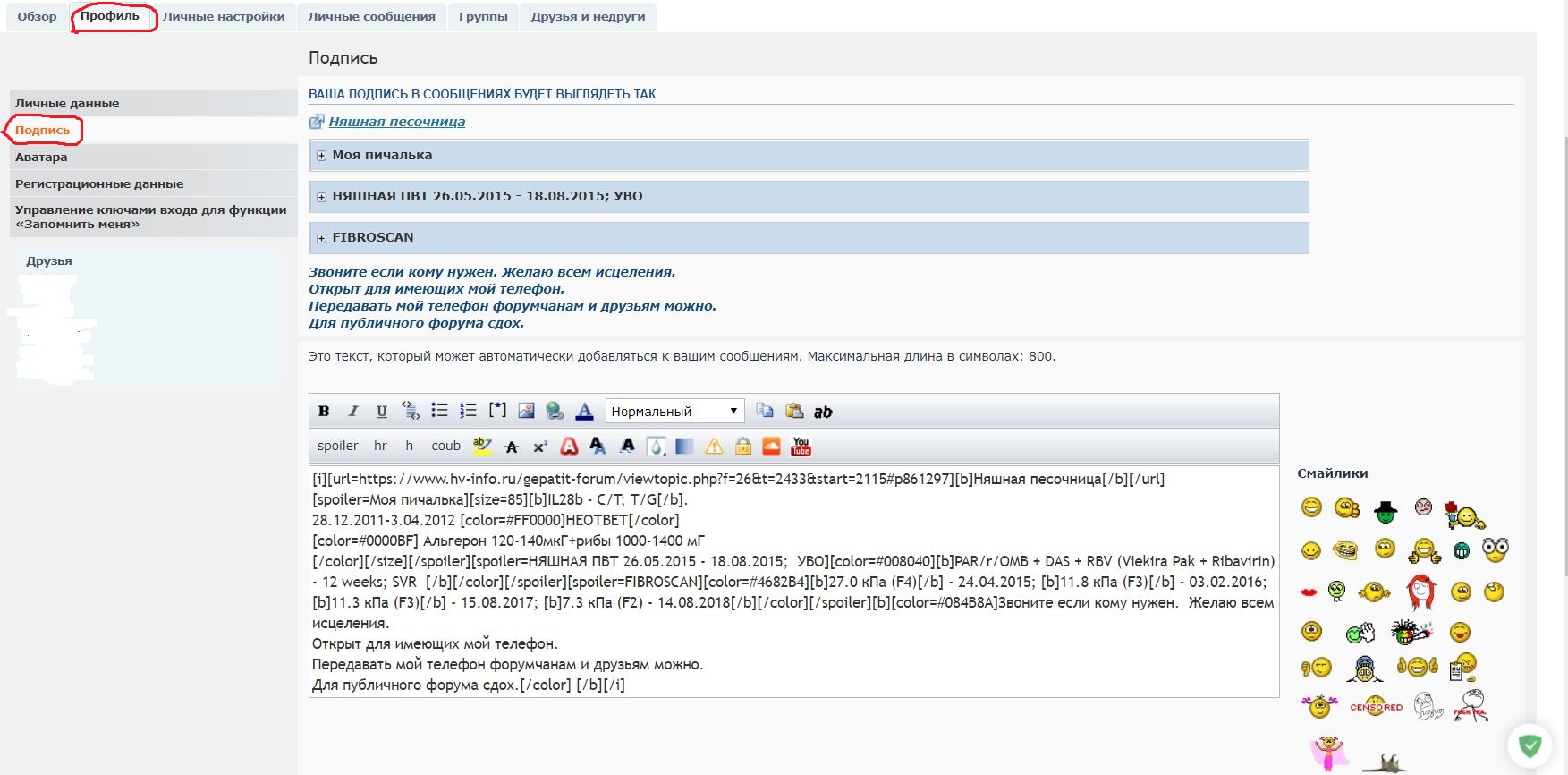 Внимание! Всем, кто проходит терапию, нужно в профиле заполнить «анкету терапийщика», где следует указать свои данные по болезни. Для этого перейдите в свой профиль, заполните или отредактируйте поля профиля и нажмите «сохранить»