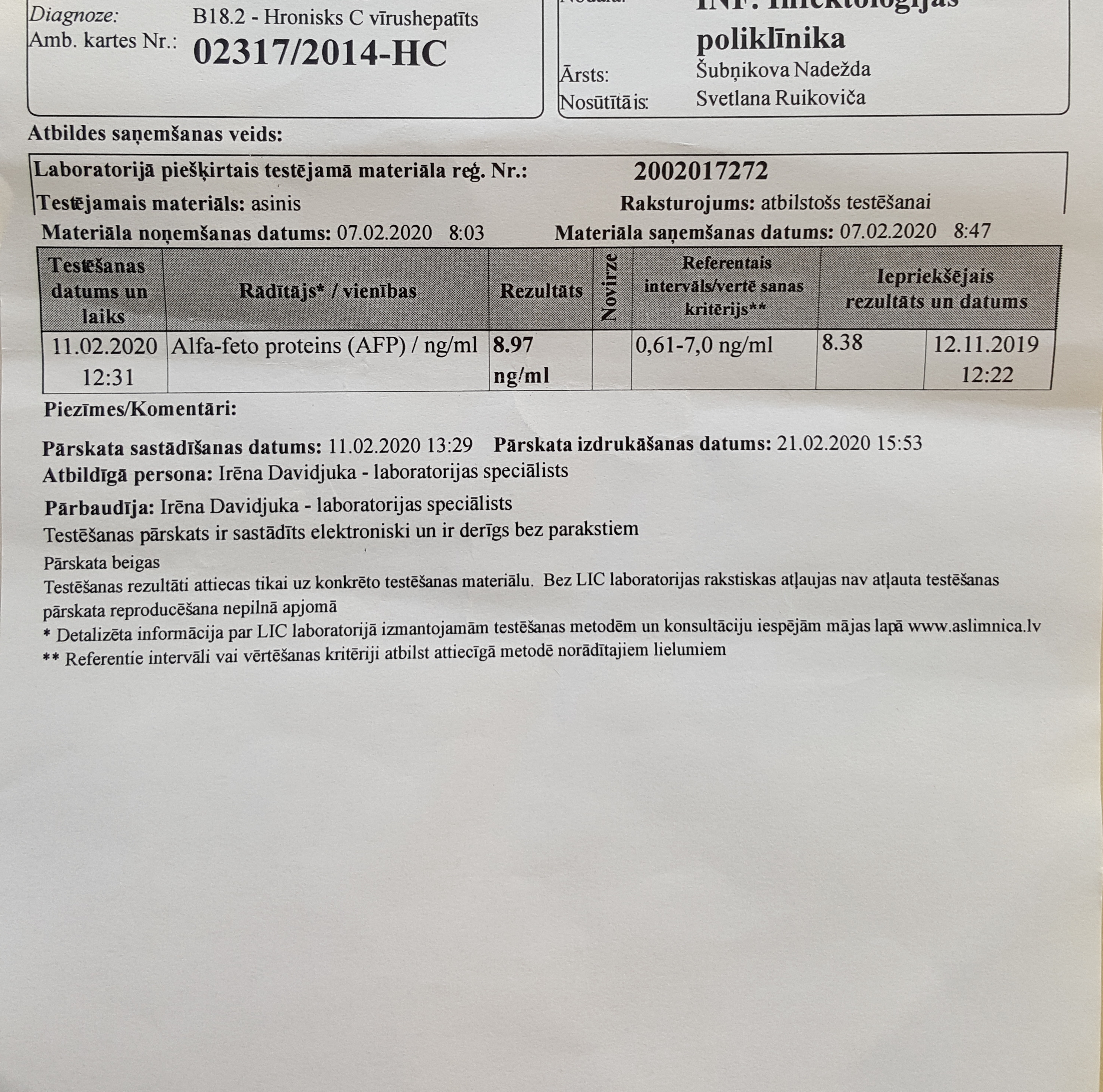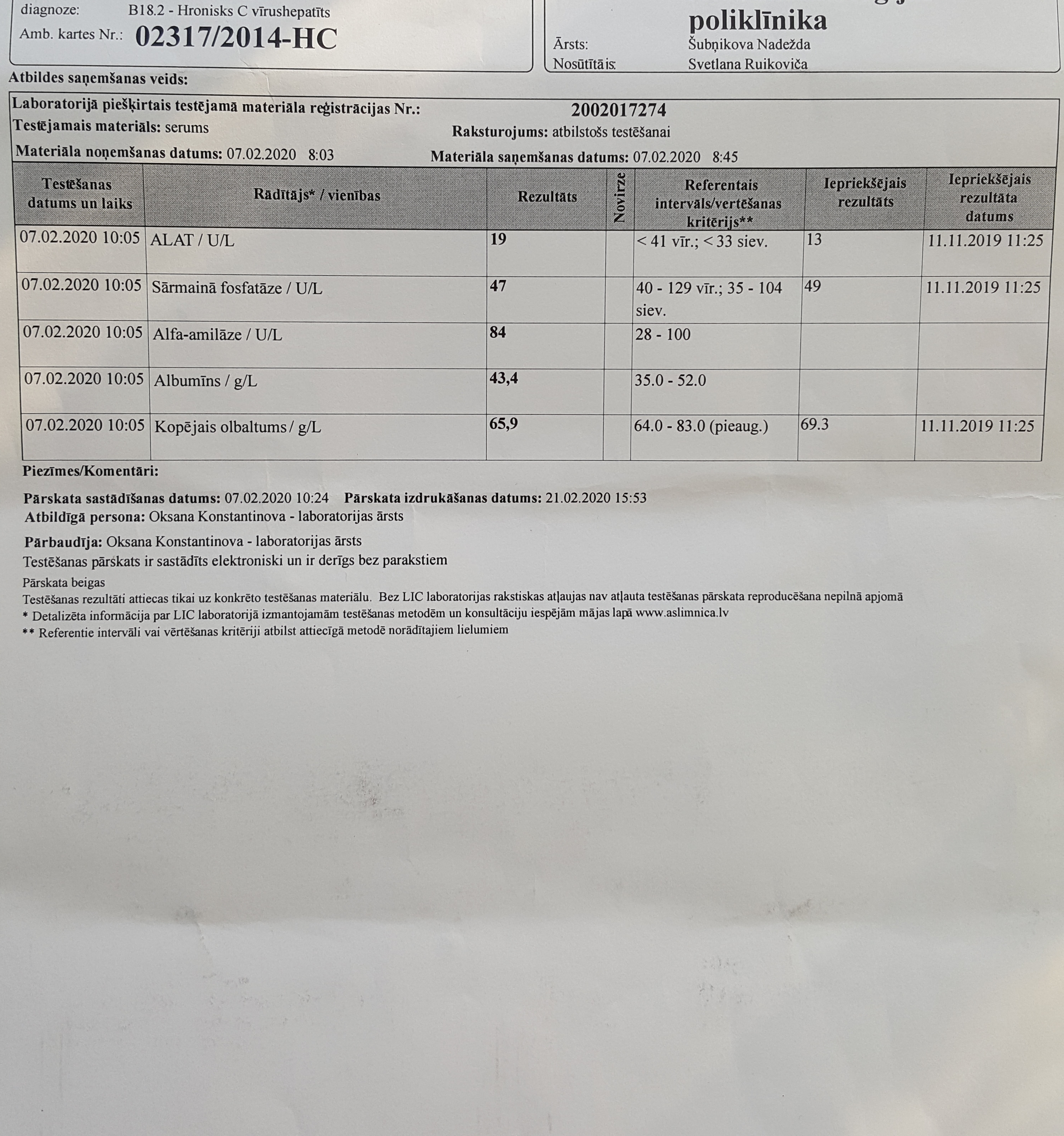 Первый раз в 2014г. лечился Пэгинтерферон по гос. программе, без результата. Второй раз в 2016г.благодаря нашему форуму заказал в Индии у GANDHI MEDICOS лекарство Hepcinat LP (в Латвии на тот момент не было эффективного лекарства, кроме Пэгинтерферона), под наблюдением лечащего врача прошёл курс. Первый анализ после окончания был отрицательный, на втором анализе положительный. В конце 2019г. по гос. программе прошёл курс лечением препаратом Zepatier. Результат тот же, что и во втором случае. После лечения анализ отрицательный, потом положительный.