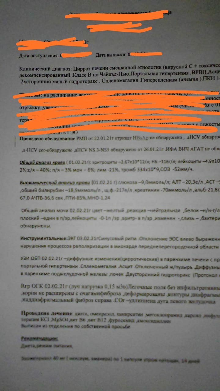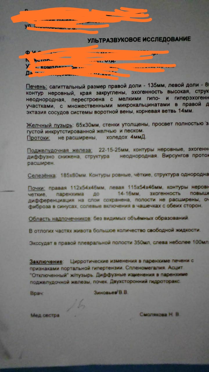 Цирроз печени смешанной этиологии( геп. С и Токсич) декомпенс. Класс В, портальная гипертензия, Врвп, асцит, 2 х сторонний Малый гидроторакс, спленомегалия, Гиперспленизм, пки 1- , глюкоза 9 , алт 20.3 , об билруб. 18.9 , Альб 21.8, Ачтв 36.6 , пти 85 %, Мно 1.24 , щ. Ф 217