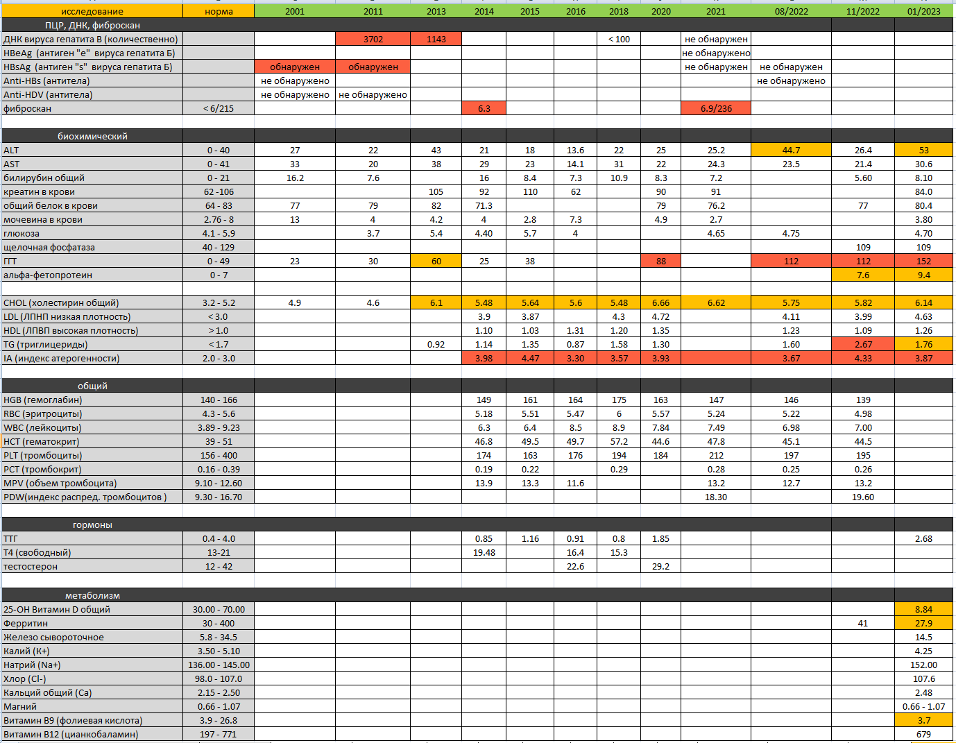 Мужчина, 39 лет. В 2001 обнаружен гепатит Б. Протекал в хронической форме. Начал вести ЗОЖ. Анализы всегда были в норме. В 2021 вирус не обнаружен. Перепроверил в 2022 HBsAg не обнаружен. Но на данный момент сильно беспокоит невыносимая утомляемость. Она не проходит вообще и каждую неделю нарастает. Энергию явно отнимает какой-то процесс. Не могу ничего делать. В правом боку ощущение чего-то инородного, с самого краю. Чувствуется как уплотнение внутри. Собрал все анализы за годы в один файл(есть свежие). Показал врачу. Говорит что гепатита точно нет и это редкий случай когда хронический уходит совсем. Но учитывая анализы, печень не может давать такие симптомы как я описываю. Я чувствую себя совсем плохо. На что обратить внимание? Какие еще сделать обследования? Не нравится нарастающий ГГТ и нарастающий альфа-фетопротеин.