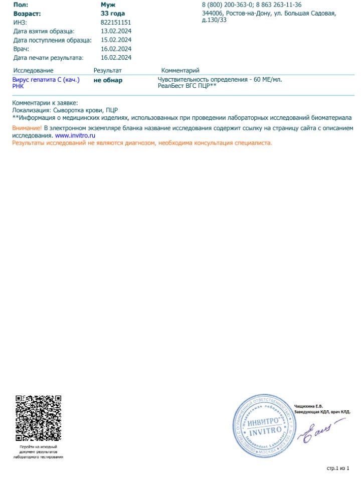 Всем привет. Заказывал препараты у Евгения. Человек надёжный. При заказе проконсультировал, помог с доставкой, сопровождал на всех этапах и т.д. и т.п. Всё действительно чётко. И за это Евгению спасибо. Но самое главное!!!!! Препараты помогли!!!! Я безумно этому рад. Я не делал промежуточные анализы, а просто соблюдал режим приёма Соф+Вел 12 недель. Не зная генотипа, стадии фиброза и других анализов. Знал только антитела и ПЦР положительный. Заказал таблетки. Начал пить. Никакой диеты не соблюдал. Но и грейпфрут со зверобоем не злоупотреблял. Алкоголь и никотин я вообще не употребляю уже давно. Во время терапии не забросил спорт. Протеин также продолжал добавлять в рацион питания. BCAA, коллаген и др.спортивные добавки- всё было. Ходил в баню, примерно каждые 2-3 недели. Работал в обычном режиме. Терапия закончилась, но я забывал сдать анализы. На днях было свободное время. Забежал в Инвитро и.... ПЦР -------------!!! Ура!!! Это победа!!! Я очень рад!!! Евгению за это отдельное СПАСИБО, что занимается этим, привозит, достает, где-то рискует, отправляет, сопровождает и самое главное- ПОМОГАЕТ нам вылечиться. Большое Вам спасибо))) Всем форумчанам- берите таблетки, не ссыте. Мне помогло и Вам поможет. Евгению и всем- спасибо, берегите себя и родных, будьте здоровы, верьте и надейтесь. Спасибо