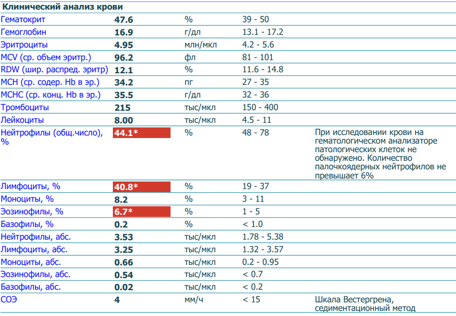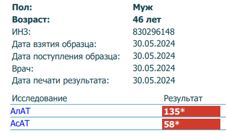 АСТ-33.6 ед/л; АЛТ-55 ед/л; тром.229 тыс/мкл.