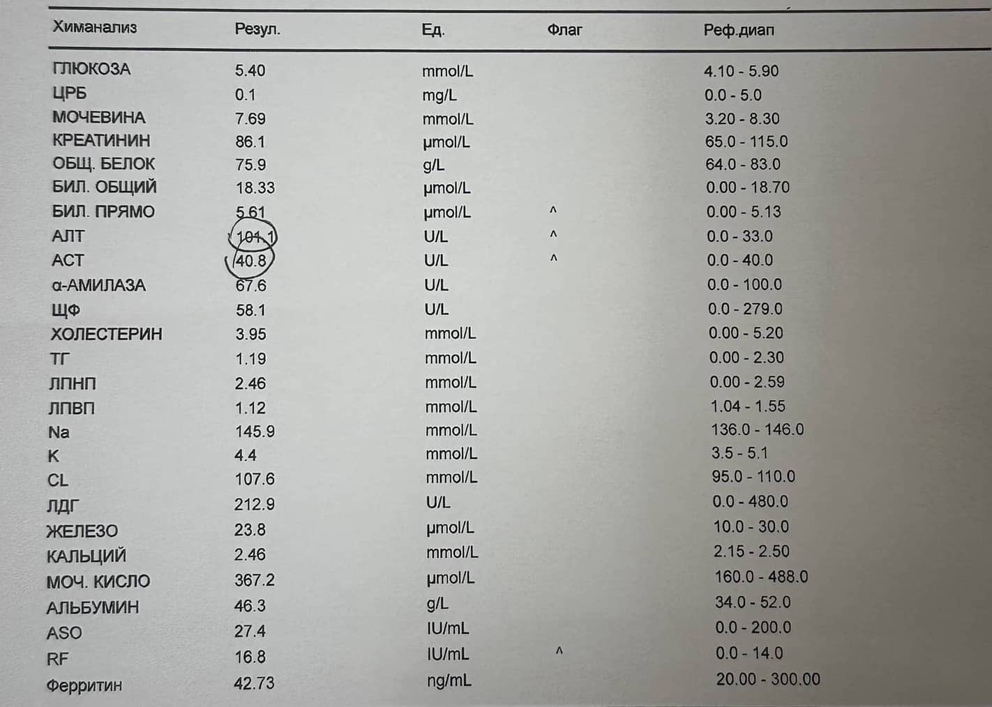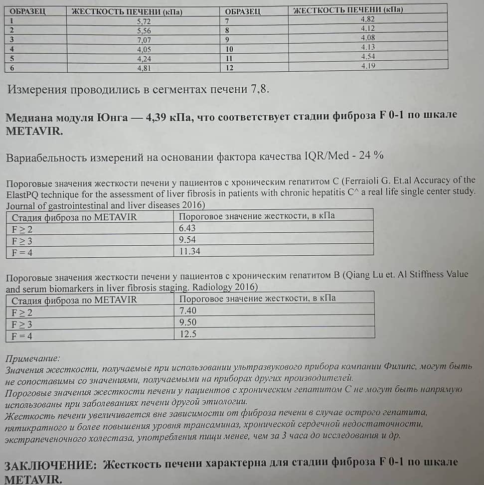 АСТ-33.6 ед/л; АЛТ-55 ед/л; тром.229 тыс/мкл.