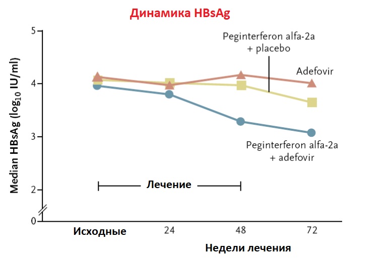 В конце наблюдения девять пациентов имели нормальные сывороточные уровни аминотрансферазы (АЛТ). У шестерых, уровень HBsAg снизился до <0,05 МЕ / мл к концу лечения; пять пациентов поддерживали ответ по HBsAg в конце наблюдения.