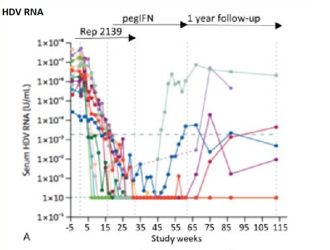 Недавно были опубликованы результаты 2-го этапа концептуального исследования REP 2139 в сочетании с Peg IFN. В исследование было включено 12 пациентов в возрасте от 18 до 55 лет из Молдовы с генотипом 1 HDV-РНК; инфекция была идентифицирована более 17 месяцев. Все были отрицательными по HBeAg, имели отрицательные или низкие уровни ДНК HBV и, как сообщается, имели хронический гепатит без цирроза; цирроз был исключен по печеночным и гематологическим параметрам, абдоминальному ультразвуку (УЗИ) и жесткости печени (KPa <10 у семи пациентов,> 10 у пяти пациентов). Концентрация HBsAg в сыворотке в начале исследования составляла> 1000 МЕ / мл. Пациенты получали 500 мг внутривенно REP 2139 один раз в неделю в течение 15 недель, а затем 250 мг внутривенно REP 2139 в сочетании с 180 мкг подкожного Peg IFN один раз в неделю в течение 15 недель, а затем монотерапией Peg IFN 180 мкг один раз в неделю в течение 33 недель. Их контролировали на протяжении 1 года после терапии. Одиннадцать пациентов стали HDV-РНК отрицательными во время лечения, при этом HDV-РНК резко уменьшалась с первых недель монотерапии REP; девять были отрицательными в конце лечения и семь в конце наблюдения.